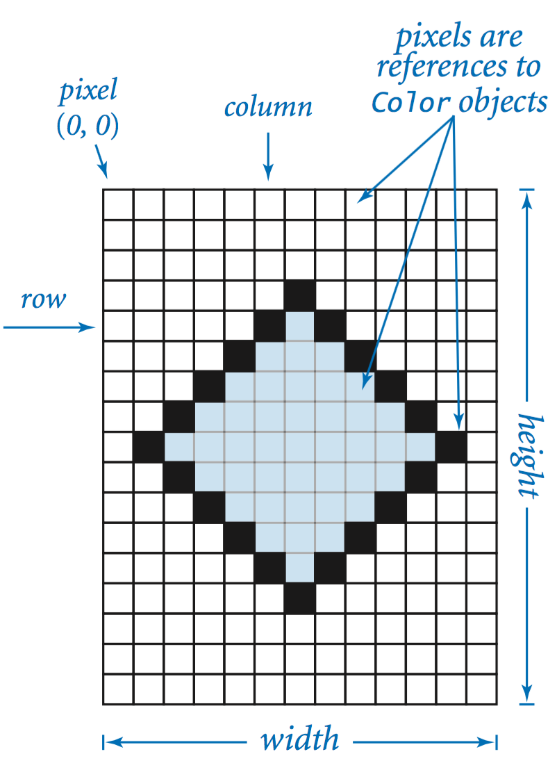 A digital image is a rectangular grid of pixels (picture elements), where the color of each pixel is individually defined. Digital images are sometimes referred to as raster or bitmapped images. In contrast, the types of images that we produce with StdDraw (which involved geometric objects) are referred to as vector images.