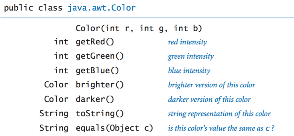 to create objects whose values represent pure red and the blue used to print this book. The following table summarizes the methods in the ColorAPI that we use in this book: