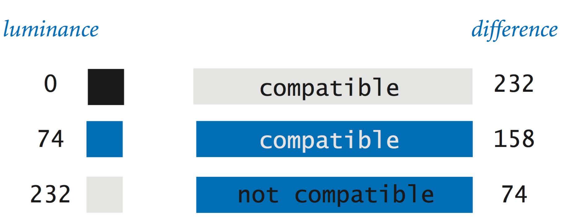Color compatibility. The luminance value is also crucial in determining whether two colors are compatible, in the sense that printing text in one of the colors on a background in the other color will be readable. A widely used rule of thumb is that the difference between the luminance of the foreground and background colors should be at least 128.
