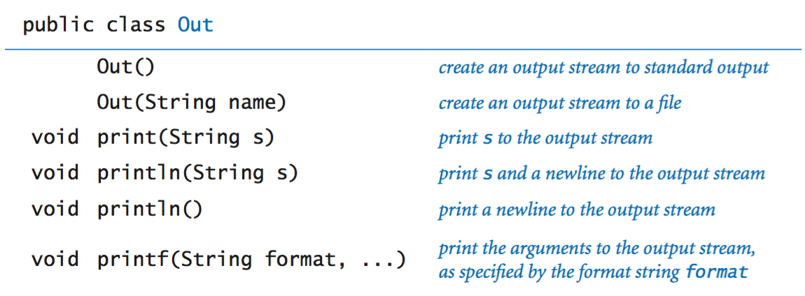 Output stream data type. Out is an object-oriented version of StdOut that supports printing text to a variety of output streams, including files and standard output.