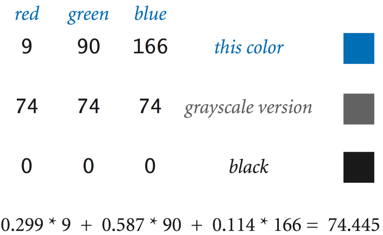 Grayscale. The RGB color model has the property that when all three color intensities are the same, the resulting color is on a grayscale that ranges from black (all 0s) to white (all 255s). A simple way to convert a color to grayscale is to replace the color with a new one whose red, green, and blue values equal its luminance.