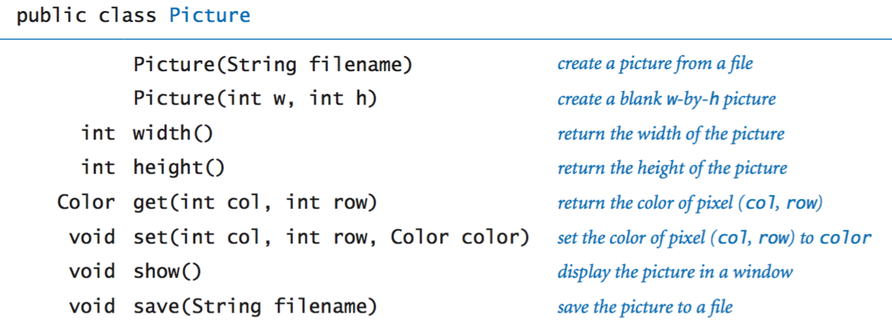The Picture data type allows you to manipulate digital images. The set of values is a two-dimensional matrix of Color values, and the operations are what you might expect: create an image (either blank or from a file), set the value of a pixel to a given color, and extract the color of a given pixel. The following API summarizes the available operations: