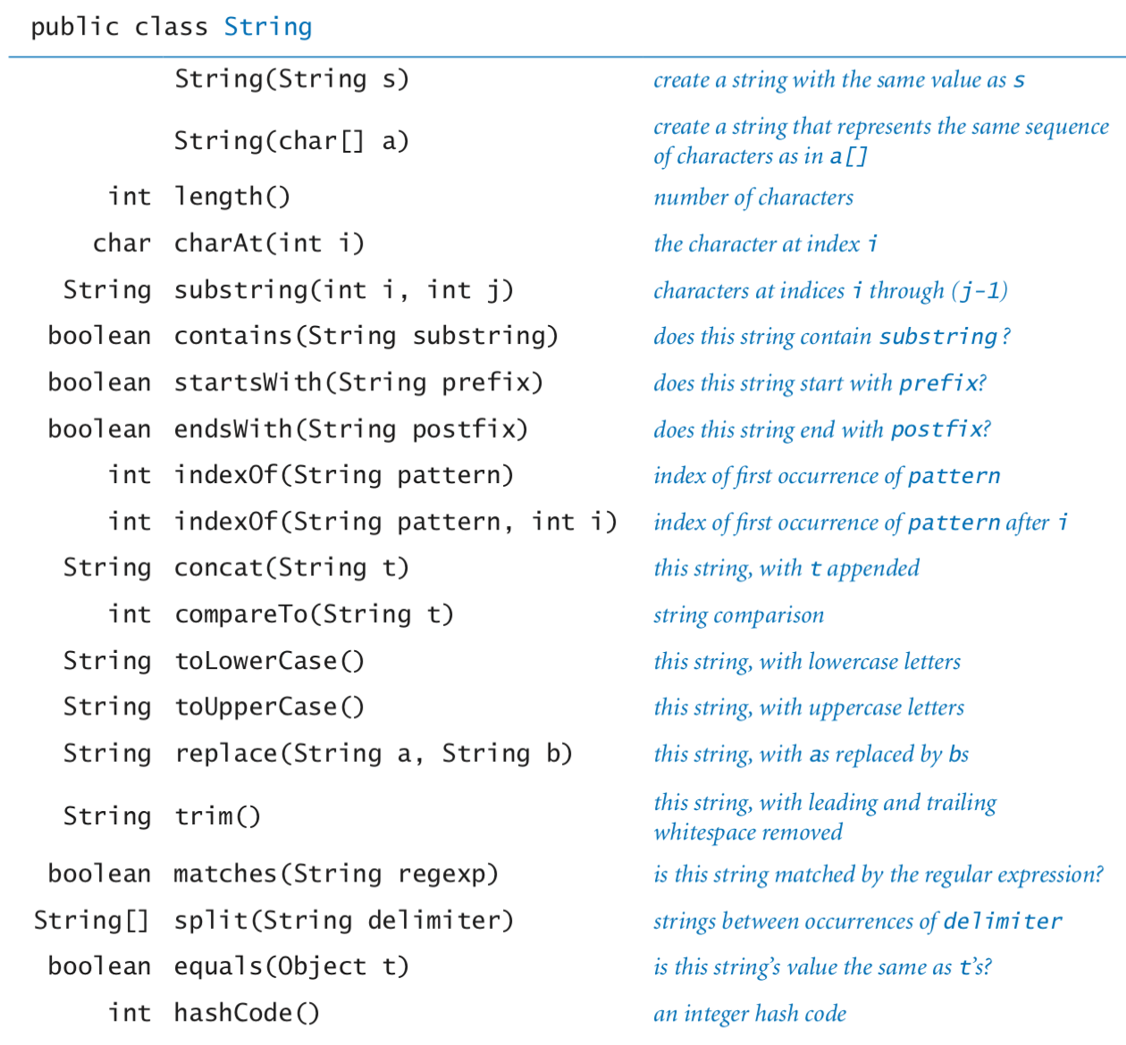 You have already been using a data type that is not primitive—the String data type, whose values are sequences of characters. We specify the behavior of a data type in an application programming interface (API). Here is a partial API for Java’s String data type: