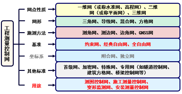 按用途、按网点、网形、施测方法、按基准、按坐标系、按其他标准划分。