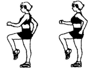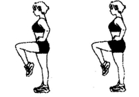 训练时,两腿依次抬起,依次落地(图4-29),下落时,注意膝、踝关节有弹性地缓冲。可反复进行踏步转体、踏步分腿、踏步并腿、弹动踏步的动作训练。