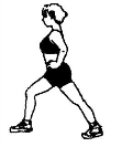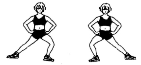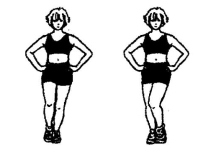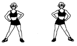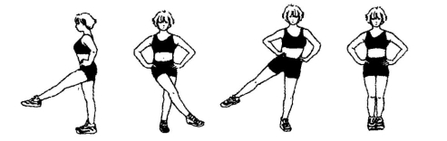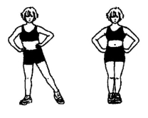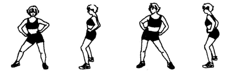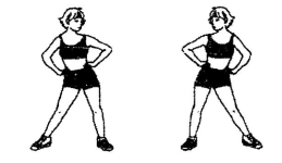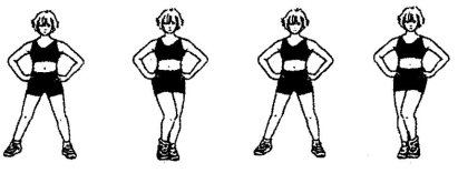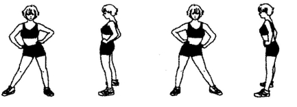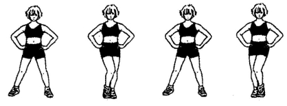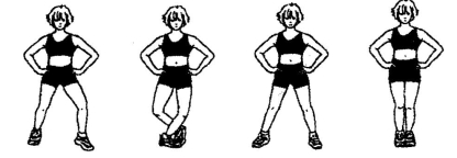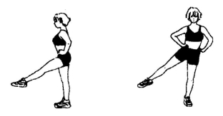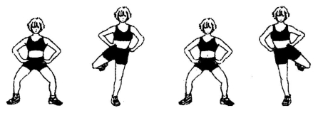训练时,两腿开立,一腿支撑并伸直,另一腿屈膝内扣,上体保持正直,用力将髋顶出(图4-9)。注意用力且有节奏感。可反复进行体前交叉顶髋、两臂侧平举顶髋、双手叉腰顶髋的动作训练。