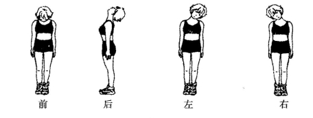 训练时,头部向前、后、左、右4个方向分别做颈部关节弯曲的运动(图4-1)。并注意身体正直,做动作时应缓慢,充分伸展颈部肌肉。重复进行前屈、后屈、左侧屈、右侧屈的动作训练。