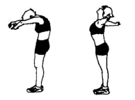 训练中,含胸时,低头收腹,收肩,形成背弓,呼气;展胸时,抬头挺胸,展肩,吸气(图4-3)。注意含胸时身体放松,但不松懈;展胸时,身体紧张但不僵硬。可进行结合手臂动作含展胸的动作训练,如手臂胸前平屈含胸、手臂侧平举展胸。