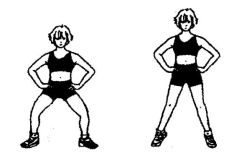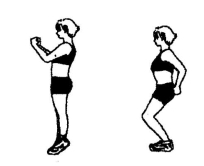 训练时,两腿左右分开站立与肩同宽或比肩稍宽,脚尖稍外开,两腿同时屈伸(图4-26),注意身体重心放在两腿之间。屈膝时,膝关节朝着脚尖的方向,同时膝关节不能超过脚尖,下蹲时身体前倾。可反复进行并腿半蹲、迈步半蹲、迈步转体半蹲的动作训练。