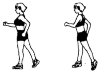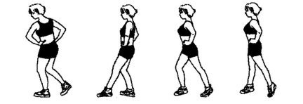 训练时,迈步移动,向前走时,脚跟先落地,过渡到全脚掌,向后走时则相反(图4-31)。注意落地时膝、踝关节有弹性地缓冲,上体可以有节奏地协调摆动。可反复进行向前向后走步、向侧前和侧后走步、向左右转体或弧线走步的动作训练。