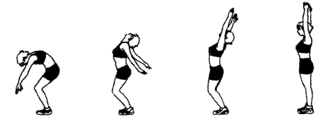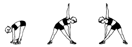 进行屈训练时,腰部向前或向侧做拉伸运动(图4-5)。注意充分伸展,运动速度不宜过快。可反复进行体前屈、体侧屈、体后屈的动作训练。