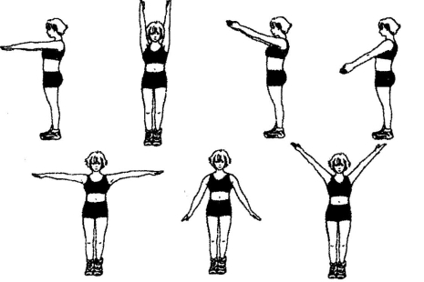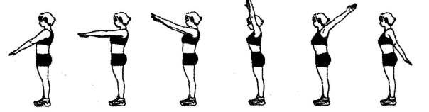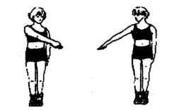 训练时,两臂或单臂以肩为轴做弧线运动(图4-24、图4-25),注意路线清晰,起始和结束动作位置明确。可反复进行两臂或单臂向内、外、前、后绕或绕环的动作训练。