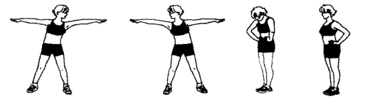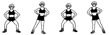 训练时,两腿微屈并拢,髋部向左右摆动,腰部要协调配合髋部动作(图4-11),注意髋部带动腰部协调摆动。可反复进行两臂侧平举随髋摆动,两臂上举随髋摆动等动作训练。