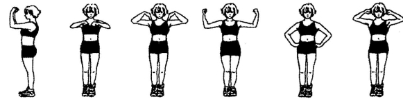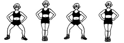 训练时,腰部做弧线或圆周运动(图4-7)。注意路线清晰、动作圆滑。可反复进行与手臂动作相结合进行腰部绕和绕环的动作训练。如一手头后屈,一手叉腰,做腰部绕环运动。