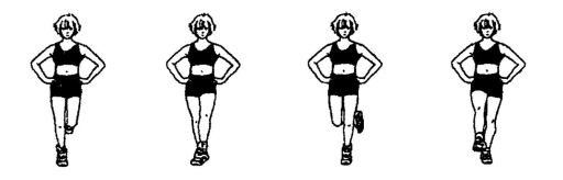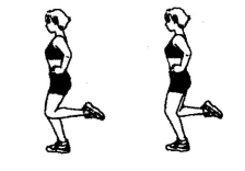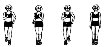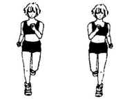 训练时,两脚依次经过腾空后,一脚落地缓冲,另一腿小腿后屈,双臂配合下肢前后摆动(图6-41)。注意膝、踝关节有弹动地缓冲,落地时由前脚掌过渡到全脚掌。可反复进行原地跑、向前跑、向后跑、弧线跑、转体跑的动作训练。