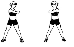 训练时,腰部带动身体沿垂直轴左右转动(图4-6)。注意身体保持紧张,腰部灵活转动。可反复进行与上下肢动作相结合协调转动的动作训练,如迈步移重心与转腰结合运动。