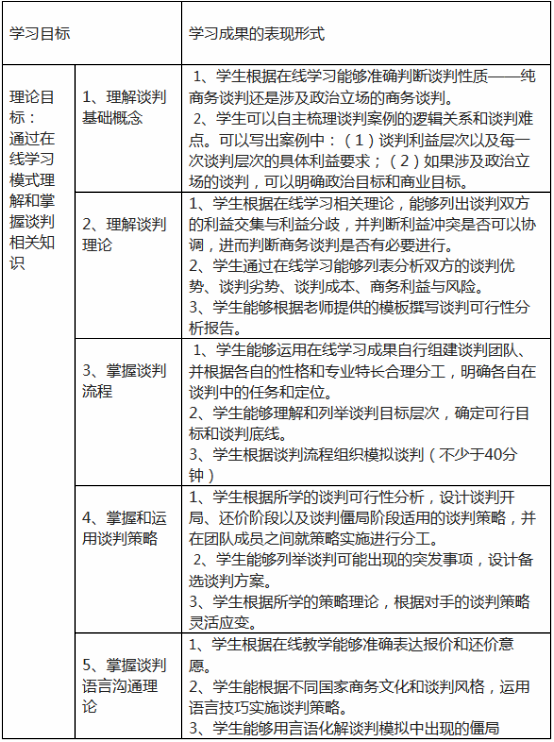 在线学习主要是谈判概念、谈判理论、谈判策略和谈判沟通等基础知识的讲解,要求学生通过自行观看微视频,根据老师提出的引导性问题,自主学习谈判基础概念和谈判理论,达到掌握理论知识点,完成相应的成果目标。同时也要求学生能够及时向老师反馈和沟通自主学习过程中的疑惑与疑点。