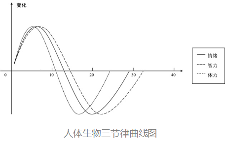 生物节律是自然进化赋予生命的基本特征之一,人类和一切生物都要受到生物节律的控制与影响。人体生物节律是指体力节律、情绪节律和智力节律。每个人从他出生那天起一直到生命终结,都存在着体力23天、情绪28天、智力33天的周期性波动规律,称为人体生物节律。每一个周期中又存在着高潮期、低潮期和临界期。由于它具有准确的时间性,因此,也称之为人体生物钟。