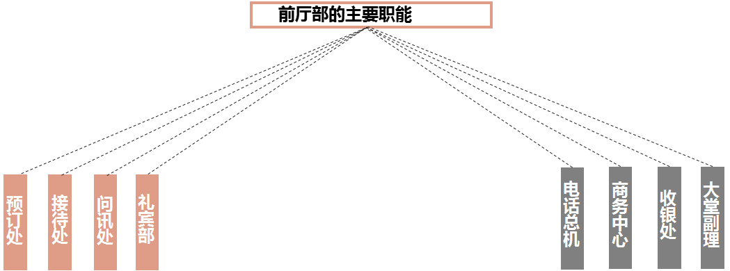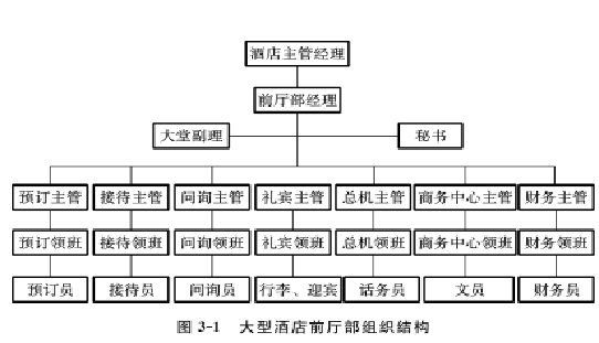 中型酒店采用前厅部与客房部并列独立的部门,直接向酒店总经理负责。前厅部内设有部门经理、领班、服务员三个层次,分工更加细致,功能也比较全面。