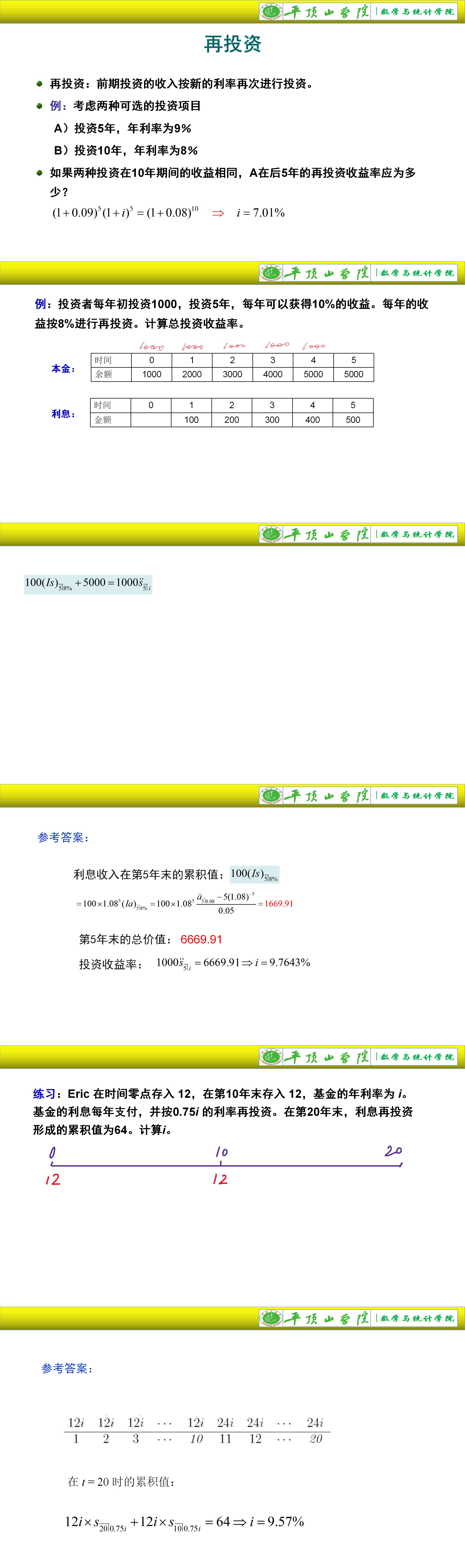 7.如果利息收入的再投资利率较低,就会拉低整个投资的收益率。在比较不同项目的收益率时,应该特别注意再投资利率的影响,即计算修正收益率。在计算修正收益率时,对资金流出使用筹集资金的利率计算其现值,而对资金流入使用再投资的利率计算其累积值。