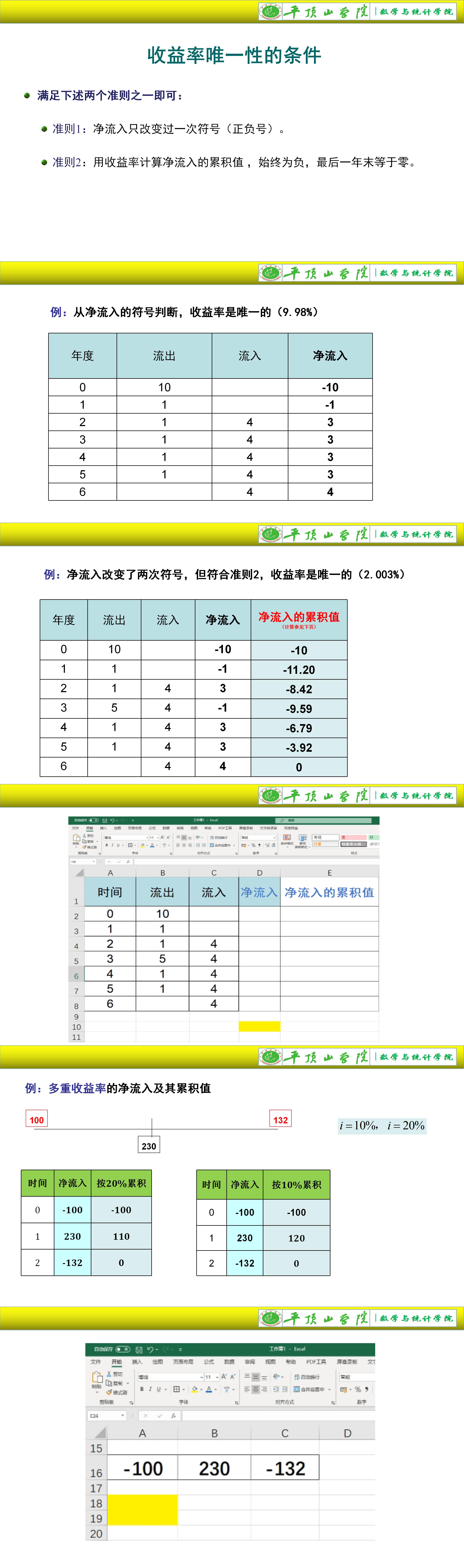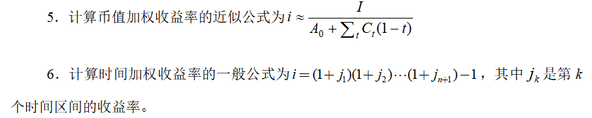 4.收益率在大多数情况下是唯一的。收益率唯一性的一个简单判断准则是:如果资金净流入只改变过一次符号,收益率将是唯一的。收益率唯一性的另一个判断准则是:如果按收益率计算的资金净流入的累积值始终为负,直至最后一年末才变为零,那么该收益率将是唯一的。