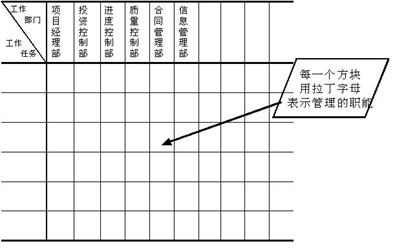 管理职能分工表是用表的形式反映项目管理班子内部项目经理、各工作部门和各工作岗位对各项工作任务的项目管理职能分工。表中用拉丁字母表示管理职能。管理职能分工表也可用于企业管理,如表。
