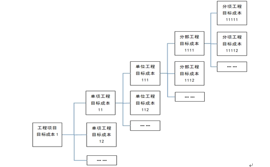 确定目标成本以及把总的目标分解落实到个相关部门、班组大多采用工作分解法。工作分解法又称建设工程项目结构分解,在国外被简称为WBS ( work breakdown structure ),其特点是以施工图设计为基础,以本企业做出的项目施工组织设计及技术方案为依据,以实际价格和计划的物资、材料、人工、机械等消耗量为基准,估算工程项目的实际成本费用,据以确定成本目标。