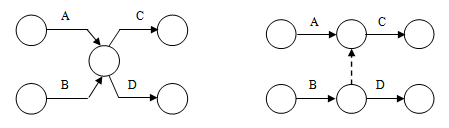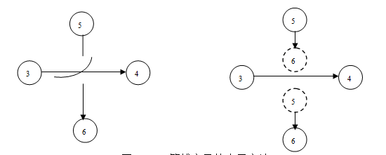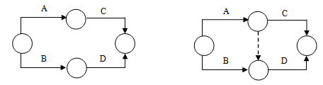 如图9(a)所示的A、B工作的紧后工作是C、D工作,如果A不是D的紧前工作,那么就要增加虚箭线切断A工作与D工作的联系,如图9(b)。