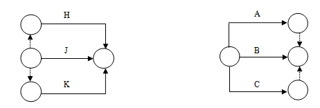 图10(a)工作同时完成时虚箭线的作用 图10(b)工作同时开始时虚箭线的作用