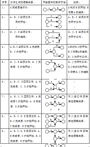 表1 双代号网络图中常见的各种逻辑关系的表达方法