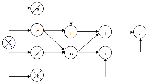 在单代号网络计划图上,可以在表示活动工作的节点的圆圈内加上“×”表示该活动已经结束,在圆圈内加上“/”表示活动已经开始,但尚未结束。图6表示某一单代号网络计划的进度状况。单代号网络计划检查方法直观明了,对于工作的进展状况一目了然。
