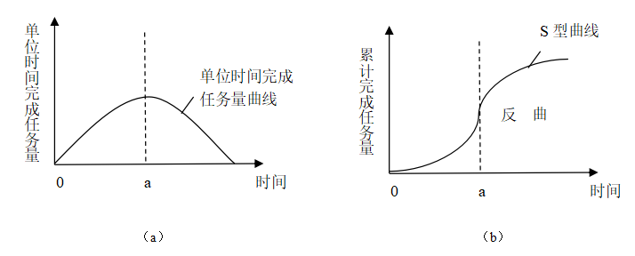 从整个工程项目实际进展全过程看,单位时间投入的资源量一般是开始和结束时较少,中间阶段较多。与其相对应,单位时间完成的任务量也呈同样的变化规律,如图3(a)。而随工程进展累计完成的任务量则应呈S形变化,如图3(b)。