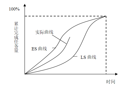“香蕉”型曲线是两条S型曲线组合而成的闭合曲线。对于一个项目的网络计划,在理论上总是分为最早和最迟两种开始和完成时间。因此,任何一个项目的网络计划,都可以绘制出两条S型曲线,即以工作的最早开始时间和最迟开始时间分别绘制出相应的S型曲线,前者称为ES曲线,后者称为LS曲线,如图4.31所示。由于两条曲线除了在开始点和结束点互相重合以外,ES曲线上的其余各点均落在LS曲线的左侧,从而使得两条曲线围合成一个形如香蕉的闭合曲线,故称其为“香蕉”型曲线。