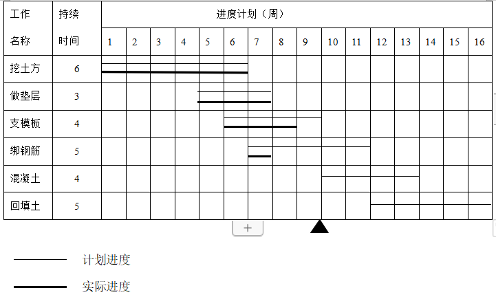 从图1中看出:在第9周末进行施工进度检查时,挖土方和做垫层已经完成,而支模板只完成了按计划到第8周末所应该完成的进度。说明到检查日期按持续时间比来衡量,计划要求此工作完成100%,而实际只完成了75%,因而这项工作实际进度比计划进度滞后了25%。