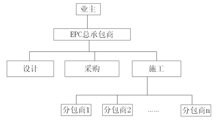 EPC模式一般适用于规模较大、工期较长,且具有相当技术复杂性的工程,如化工厂、发电厂、石油开发等项目。其合同结构形式如图3所示。
