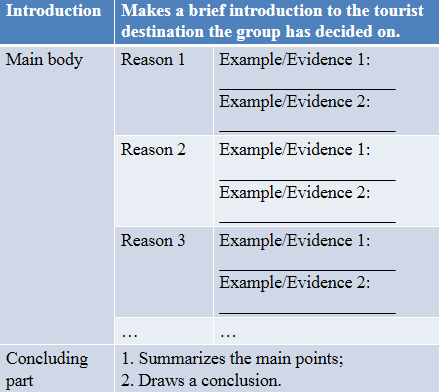 Search for information about the tourist destination. You can divide the whole work,and each of you is responsible for one section. For example, three students may be responsible for the reasons, each searching for one. And the fourth student searches for some general information about the place so as to prepare for the introduction and conclusion parts of the presentation.