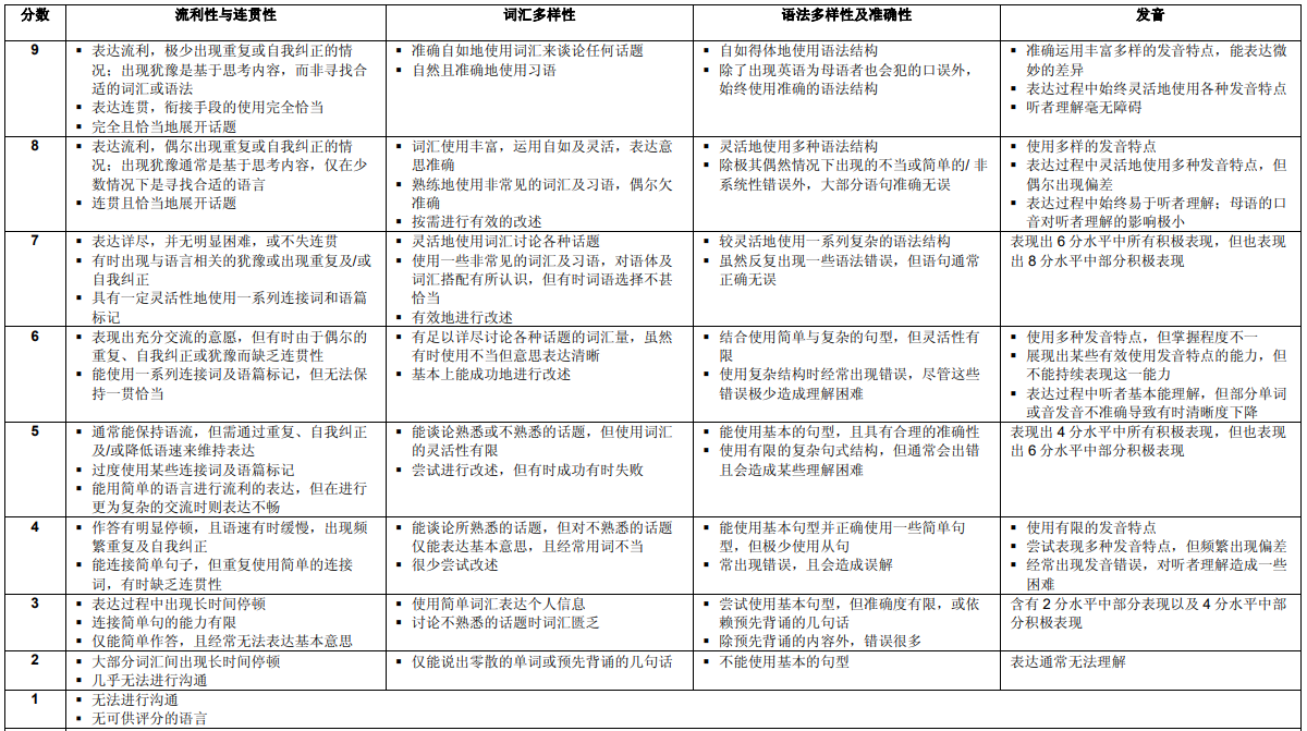 口语考试题型:雅思考试通过考生与考官之间进行一对一交流的形式对考生的英语口语水平进行考察,是最接近真实生活场景的互动式测评。所有的雅思考官会接受统一的培训与严格监控以确保其按照全球统一标准对考生进行评判,标准共分为四项:流利性与连贯性、词汇多样性、语法多样性及准确性、发音。每场考试都会全程录音以进行后期监测,保证口语考试的客观性和公平性。
