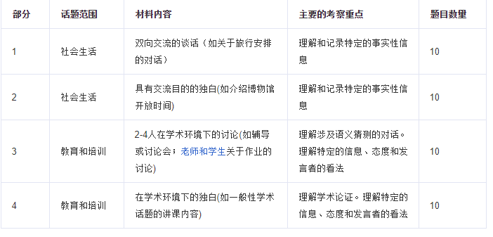 听力考试题型:共包含4段独白和对话。每段听力材料只播放一次,对应10道问题,问题的排列顺序和答案在听力材料中出现的顺序一致。