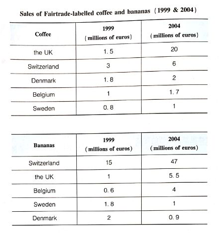 We can see from the second table that Switzerland bought far more bananas than the other four countries (本段的第1旬选择概括哪一类数据明显多于其它的各类数据). (开始进入数据细节的“X句") Swiss sales figures rose sharply from 15 to 47 million euros across these five years, while (体现比较意迟) in the UK and Belgium sales only grew from 1 to5.5 million euros and from 0. 6 to 4 million euros respectively. Sweden and Denmark showed a different pattern (比较意识:呈现出不同的特征), with falls in banana sales from 1. 8 million euros to 1 million euros and 2 million euros to 0.9 million euros. (介绍数据细节的“X句"对5个国家的数据严格按照增长得最多、增长得比较少、减少的顺序排序介绍,不仅体现了适当的比较意识,而且也形成了清晰的秩序感)
