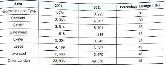 The table below shows changes in the numbers of residents cycling to work in different areas of the UK between 2001 and 2011.