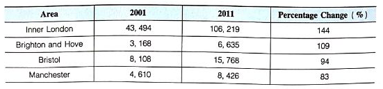 The other nine areas all had fewer than 10 thousand people cycling to work in 2001 and in 2011, but they also saw a significant increase in the number of cycling commuters over the 10-year period (类比数量上的区别和趋势上的相似之处). The area of Brighton and Hove saw the biggest percentage change of these nine areas (109%). The numbers of cycling commuters in Gateshead (816 in 2001 and 1, 314 in 2011) were the lowest of all the areas shown in the table (介绍特征值,对于非特征数据则同样不追求“面面俱到”).