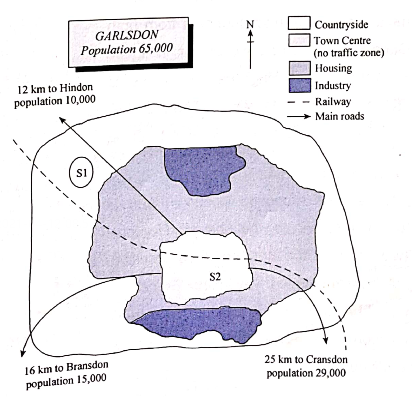 The map below is of the town of Garlsdon. A new supermarket (S) is planned for the town. The map shows two possible sites for the supermarket.