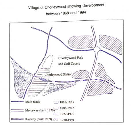 From 1868 t0 1883, the village of Chorleywood only covered a small area between a main road and the area where Chorleywood Park and Golf Couse is now located. Over the next period (1883 to 1922), the village expanded southwards along the main road and more than doubled in area. In 1909, a railway line was built crossing the village of Chorleywood. Then, the village grew along the railway line to the east and west until 1970. AL that time, a motorway was built to the east of the village. The last period(1970 to 1994) saw further development of Chorleywood around the motorway intersections with the railway line and one of the main roads.