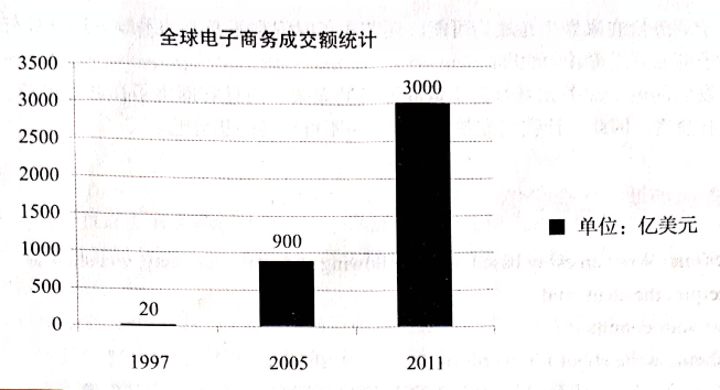 由以上柱状图可以看出,在过去十五年中,全球电子商务年成交额显著增长。1997 年,全球电子商务成交额约为20亿美元,而2005年这一-数据增长到 900亿美元。2011年这一数字飞涨到3000亿美元,是1997年的150倍。