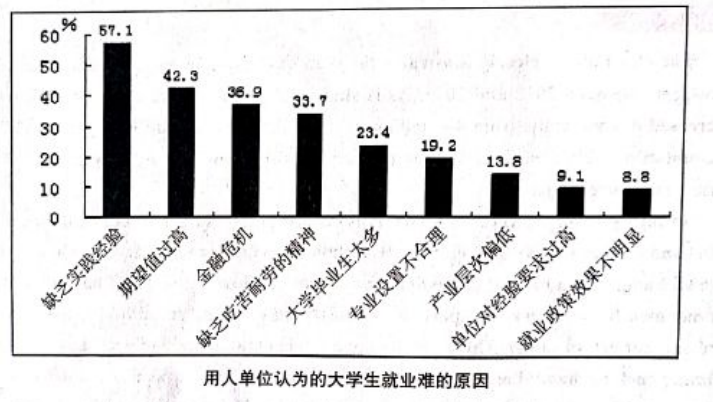 上述柱状图揭示了大学生就业越来越难的各种原因。在用人单位看来,缺乏实践经验、期望值过高和金融危机排在前列,分别占57.1%、42.3% 和36.9%。