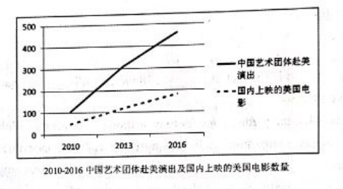 在线状图中显而易见的是,中国艺术团体赴美演出的次数和国内上映的美国电影数量从2010年至2016年均在增长。在这六年中,中国艺术团体赴美演出的场次从100场猛增到460场,而国内上映的美国电影数量从50部稳步增长到约180部,增长了约130部。