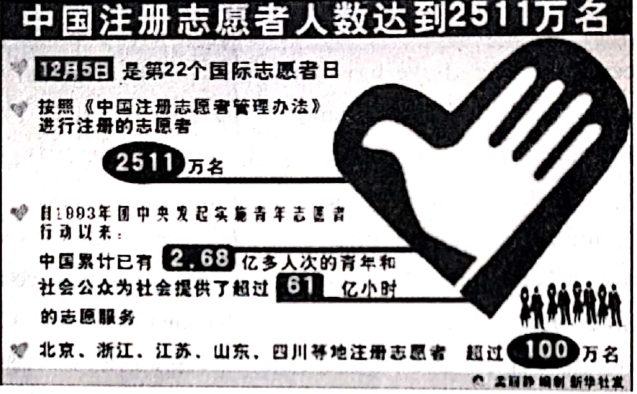 In the picture above is the symbol of volunteering with the image of a red heart and a peace dove. According to the diagram above, the number of registered volunteers in China has reached 25.11 million. There are already 268 million young people and public citizens who have provided more than 6.1 billion hours of volunteering service.