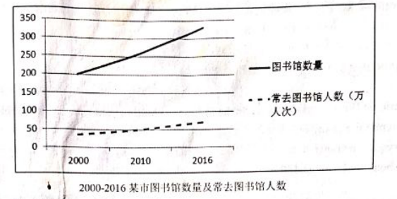 2000年至2016年间,某市图书馆的数量以及常去图书馆的人数均出现了显著的变化。如曲线图所示,同期图书馆的数量从200所稳步增长到330所,而在这16年当中,常去图书馆的人数从35万人急剧增加到70万人,增长了35万人。