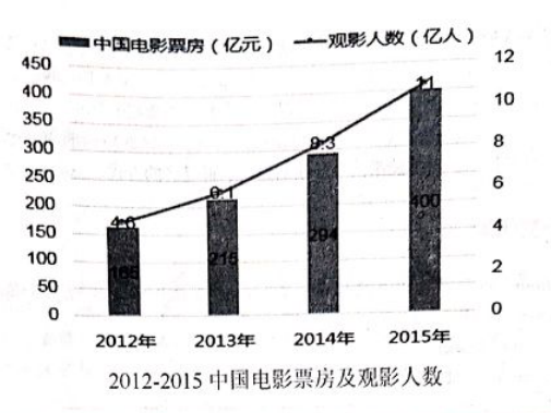 The chart above clearly illustrates the data of Chinese movie box office income and film-goers between 2012 and 2015. As is shown in the chart, the number of film-goers increased dramatically, from 460 million to 1.1 billion, during the four years, while the amount of box office income has been on a steady rise, from 16.5 billion yuan to 40 billion yuan, in the same period.