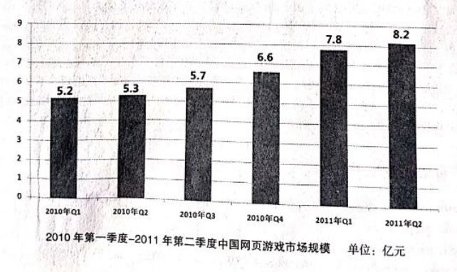 上述柱状图揭示了2010年第一季度至2011年第二季度中国网页游戏的市场规模。在这一年半之中,市场规模有了急剧的增长,从5.2亿元急剧上升到8.2亿元,增长了3亿元,同比增长率超出50%。
